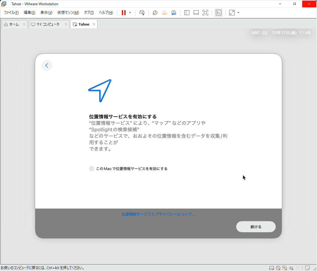 「この仮想マシンをパワーオンする」でTahoe vmを起動すると、Tahoeのインストールが進みます。